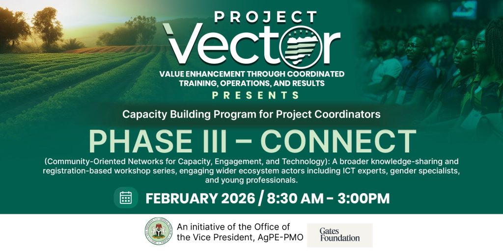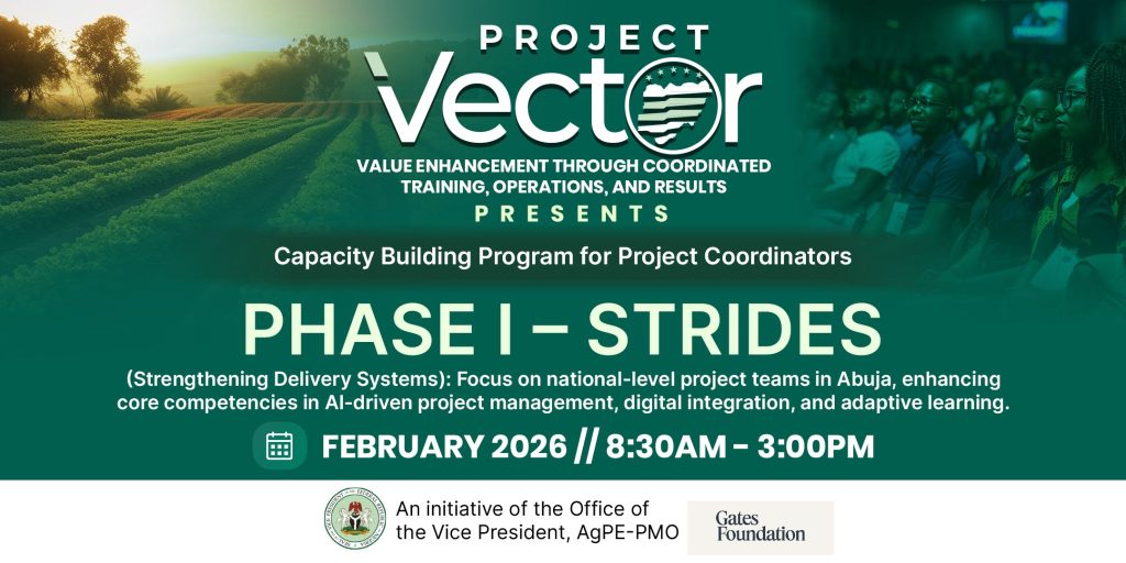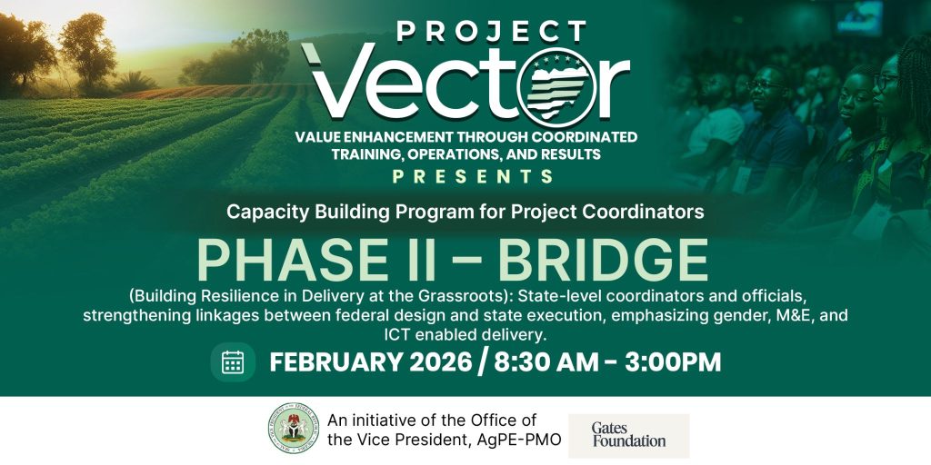 In pursuit of that responsibility, the Agribusiness and Productivity Enhancement Project Management Office (AgPE-PMO), under the Office of the Vice President, designed and launched Project Vector (Value Enhancement Through Coordinated Training, Operations and Results), a structured, three-phase national capacity-strengthening programme built to equip agricultural project teams at every level with the tools, knowledge, and networks to deliver results.